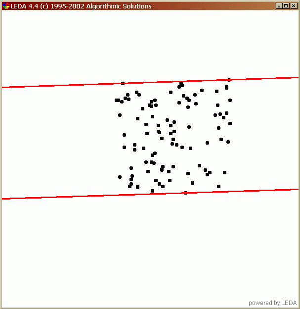 #include <LEDA/core/list.h> #include <LEDA/geo/rat_point.h> #include <LEDA/geo/random_rat_point.h> #include <LEDA/graphics/window.h> #include <LEDA/geo/geo_alg.h> using namespace leda; int main() { list<rat_point> L;random_points_in_square(100,50,L); rat_line l1, l2; rational w=WIDTH(L,l1,l2); window W;W.init(-150,110,-150); W.open(); W.display(); W.set_line_width(3); W.set_node_width(3); rat_point p; //draw points in L forall(p,L) {W.draw_filled_node(p.to_point());} W.read_mouse(); //draw l1 and l2 in red W.draw_line(l1.to_line(),red); W.draw_line(l2.to_line(),red); W.read_mouse(); W.screenshot("width"); return 0; } |